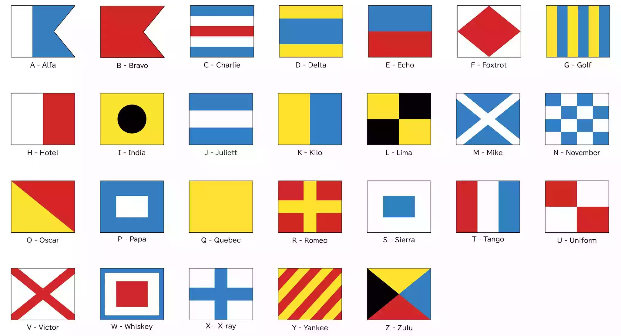 Her harfin kendine ait özel bir bayrağı ve tek başına çekildiğinde özel bir anlamı vardır. Ayrıca birden fazla bayrak birlikte çekilerek kodlu mesaj oluşturulabilir.