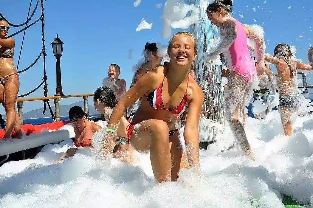 Bodrum’un sıcak güneşinin altında, denizin mavisinde, büyük bir teknenin güvertesinde bulunacaksınız. DJ’lerin en enerjik müzikleri eşliğinde, dans pistinde arkadaşlarınız veya yeni tanıştığınız insanlarla coşku dolu danslar yapacaksınız. Köpükler, dans pistini kaplayacak ve herkesi renkli ve eğlenceli bir atmosfere sürükleyecek.